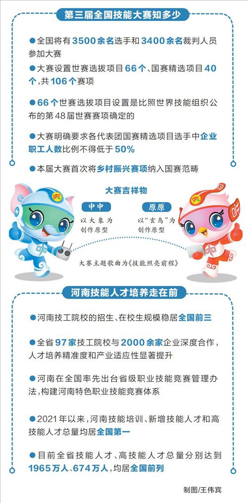 第三届全国技能大赛组委会委员、秘书处秘书长,大赛执委会执行副主任,河南省人力资源和社会保障厅厅长丁同民在发布会上介绍,河南对标技能竞赛先进理念、技能标准和评价体系,全力推进技工院校学校布局、专业结构、培养模式“三个调整优化”,目前河南技工院校的招生、在校生规模稳居全国前三。全省97家技工院校与2000余家企业深度合作,人才培养精准度和产业适应性显著提升。