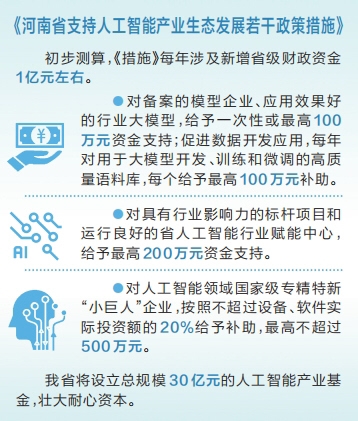 河南是全国重要的经济大省、工业大省和人口大省,拥有海量的数据资源、丰富的应用场景、广阔的市场空间,具备在人工智能领域取得突破性发展的优势和条件。省发展改革委有关负责人说,省委、省政府高度重视人工智能发展,提出开展人工智能+”行动,奋力建设数智强省。为进一步强化政策供给,更好发挥财政引导与支撑作用,我省出台《措施》,贯彻落实中央决策部署,聚焦“1+2+4+N”目标任务体系,系统提出我省支持人工智能产业生态发展的政策举措。