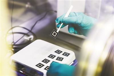 研究人员制作的钙钛矿-硅叠层太阳能电池。