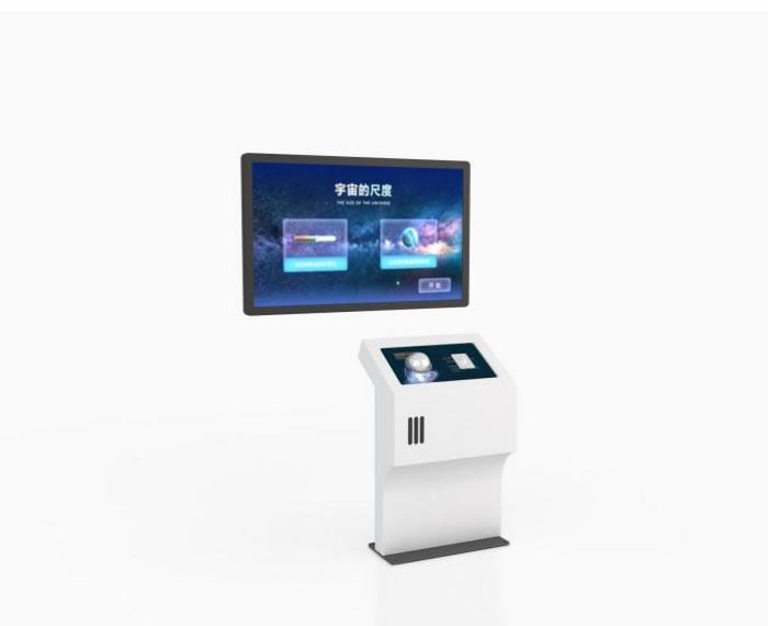 展项主要通过多媒体互动进行展示。主要由展台、滚轮、轨 迹球、传感器、计算机、显示器等组成。观众滚动滚轮 ,改变宇宙尺度,传感器会即时检测滚轮位置,触发显示屏播放多媒体视  频介绍一定范围尺度内的相关影像。观众还可通过滚动轨迹球,选中该尺度下的参照物,了解参照物的详细信息及从宇宙到微观  世界的尺度变化。