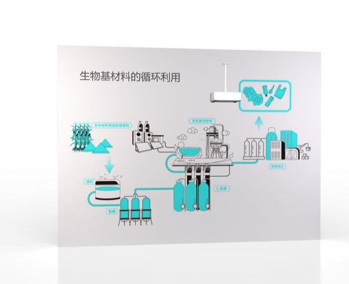 互动时观众触碰墙面线稿 ,投影会出现相应动态画面展示。 向观众展示以玉米秸秆或淀粉为原料 ,经过液化制糖、 L-乳酸、 聚乳酸或聚乳酸共聚物、聚乳酸改性材料 ,到可降解购物袋、一 次性餐具、薄膜、水稻育秧盘、被服等终端产品完整产业链条。
