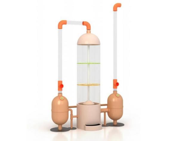 展项主要是由电机、 PC透明罩、风机和PVC管构成。小球 通过风机吹入罐中 ,中央旋转杆拨动小球 ,小球从顶端亚克力托盘的孔洞依次层层掉入 ,最终落入底端的收集槽。