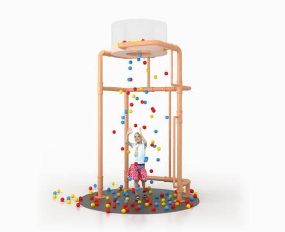 展项主要是由亚克力罐状模型、管道和电机构成。通过前面的互动装置 ,给收集池增加的小球随着管道进入小球储存罐中 ,通过机电操作,底部光圈造型的释放口会打开,形成小球雨。