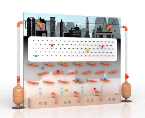启动风机装置后,将小球投进入球口,小球在压强差的影响下进入管道运动,展品中包含概率槽和交叉轨道。落入概率槽中的小球,在圆柱形钉子阵里下落,最后落入概率槽底部的收集槽中。