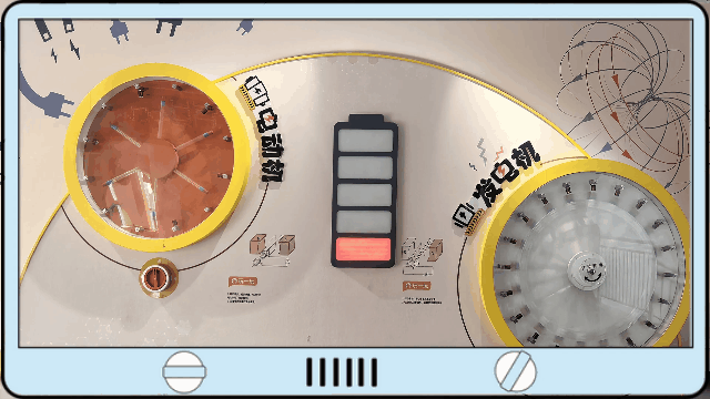 发电机:当我们转动“手轮”,发电机在外力的作用下,发电机中的线圈在磁场中切割磁感线产生感应电动势,内部线圈与外部电路构成一个闭合的回路,从而将机械能转化为电能。“手轮”转动越快,线圈转动速度越快,单位时间内导电线圈切割磁力线的次数越多,产生的电能就越多。