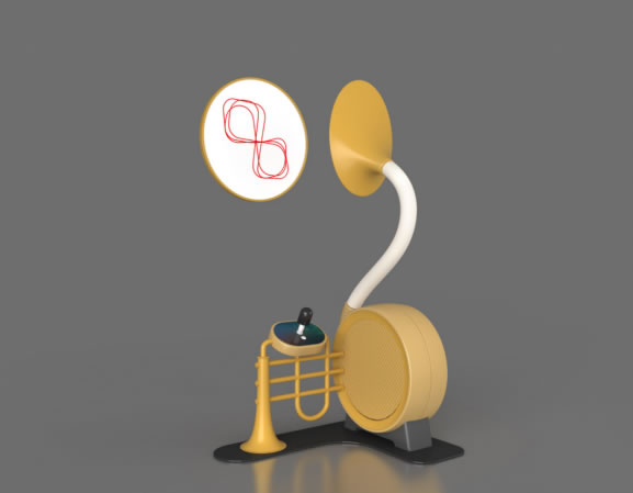 展品由喇叭模型、扩音器、激光发射器等组成。在喇叭模型的出声口处设置一个镜面与激光发射器。