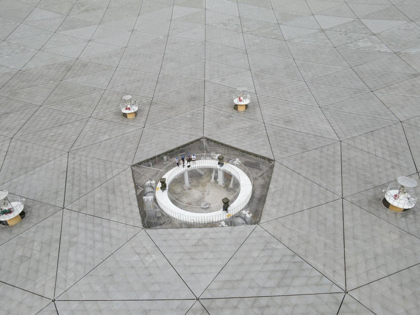 “天眼”底部的“洞”是怎么来的,为什么会存在这个五边形缺口?答案与FAST望远镜的一项重要基础设施——位于反射面底部的馈源舱停靠平台有关。馈源舱是一个直径约13米、重30吨的金属舱体,舱体内装载着超低温制冷的接收机、馈源喇叭等精密仪器。可在百米范围内实现毫米级的精准移动和姿态调整,核心作用是确保舱内接收机稳定接收反射面汇聚的宇宙无线电波信号。