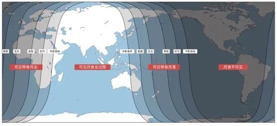 本次月全食全球见食情况示意图--图源《天文爱好者》杂志