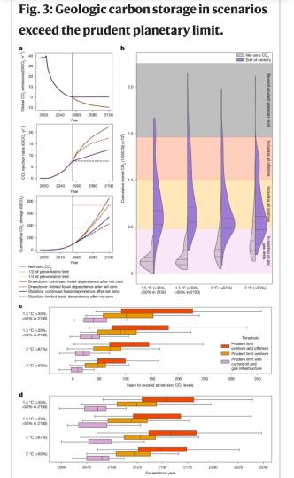 在本项研究中,论文第一作者和通讯作者、奥地利国际应用系统分析研究所Matthew J. Gidden与同事及英国、法国、德国等合作者一起,在分析稳定地质构造的同时考虑到环境敏感地点、与人口中心的距离,以及缺乏政府支持这类风险因素,从而量化了地球实际能支持的地质碳储量。他们研究发现,这种更谨慎的估算得出的地球二氧化碳地质封存潜力为1.46万亿吨,而且这一潜力可能在2200年被用尽。