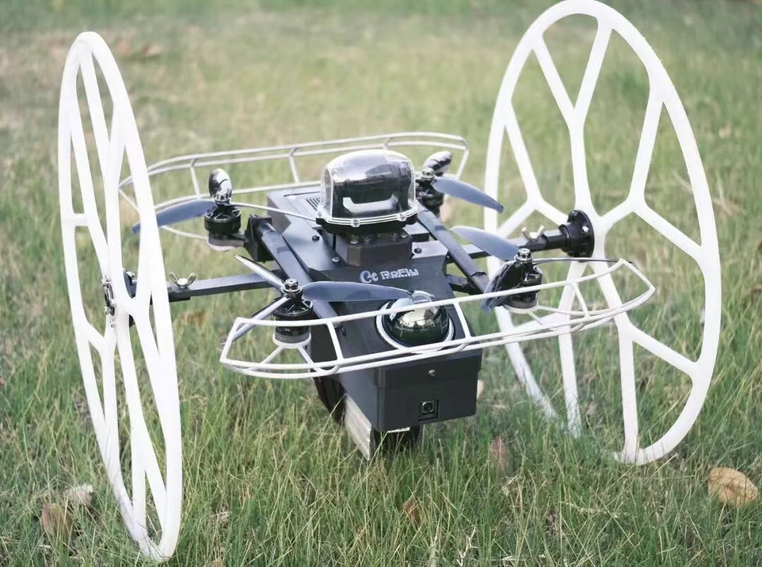 空地两栖无人机自重约为2.2kg,飞行时比较耗能,但在地面滚动就很节能,因此在地面状态良好的情况下更能发挥无人机能效和续航的优势,遇到障碍物,短暂起飞越障即可。