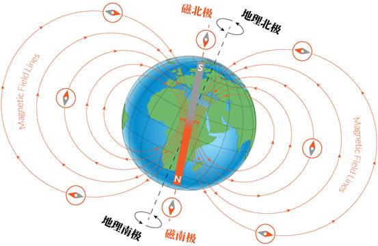 简单来说,地球的地理北极(自转轴北端,大致指向北极星位置)与磁北极(磁场北极点)并不重合,而罗盘指向的是磁北极。因此,在地球的大部分区域,罗盘指针与地理北极之间都会存在一个夹角,这个夹角就叫作“磁偏角”。