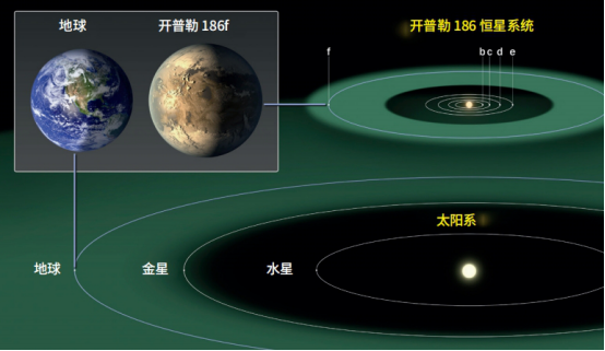 开普勒186是一颗距离我们约490光年远的红矮星,在这个恒星系内共包括5颗系外行星,其中4颗都过于靠近恒星,只有开普勒186f恰好位于宜居带内。这也是开普勒空间望远镜首次发现位于宜居带内的且与地球大小最为相近的系外行星。开普勒186f发现于2014年,其直径是地球的1.17倍,质量是地球的1.4倍,表面平衡温度是-85℃,公转周期130天。出于对这样一颗与地球极为相似行星的好奇,搜寻地外文明计划(SETI)还利用射电望远镜阵对它进行了监测,不过并没有发现任何来自于这颗天体的射电信号。图为开普勒186f与地球在各自系统宜居带中所处的位置以及大小对比示意图。