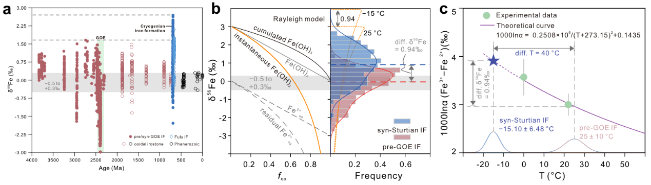 a)地球历史时期铁建造的铁同位素值分布;(b)铁建造形成过程的铁同位素瑞利分馏模型及其雪球时期铁建造和大氧化事件前铁建造的δ56Fe值的相对频率分布;(c)基于铁同位素分馏的温度依赖效应推算,雪球地球卤水温度可低至 –15 ± 7