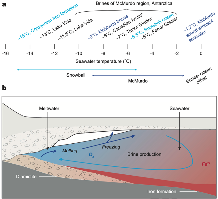 a)雪球时期与现代南极水域温度对比;(b)成冰纪铁建造沉积与卤水形成模式