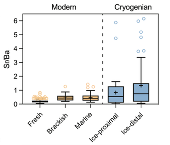雪球时期盐度指标(Sr/Ba比值)与现代海水的对比