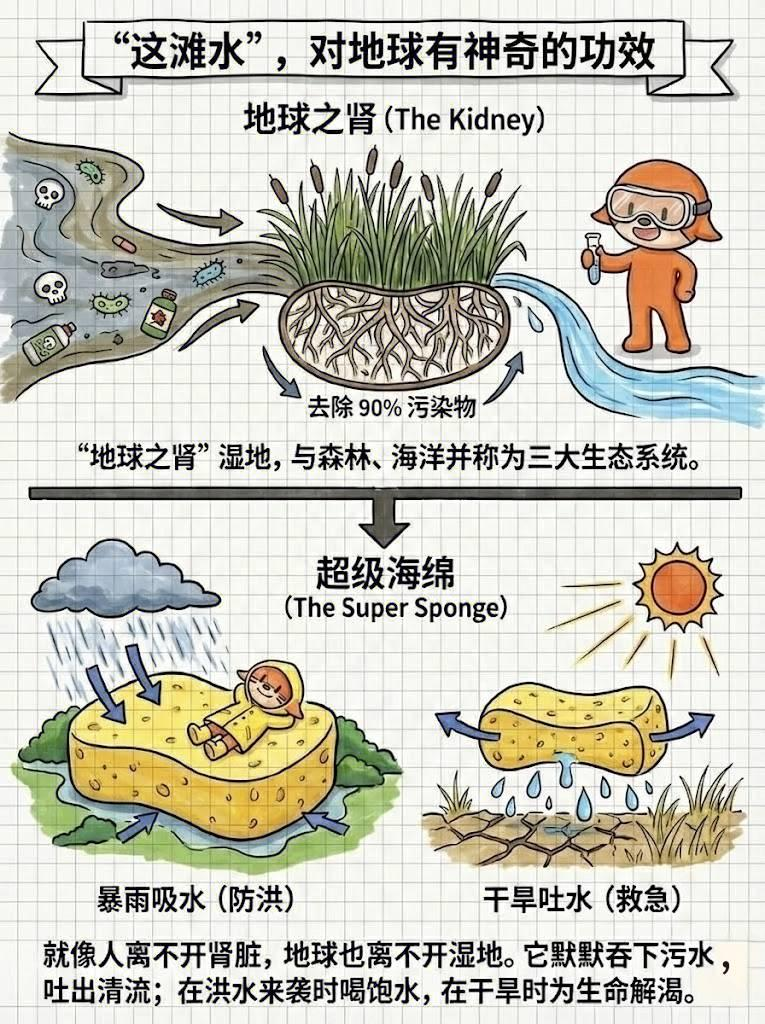 湿地对人类至关重要,它被称为地球的“肾”和“海绵”——既能净化水体,又能调节水文、平衡气候。
