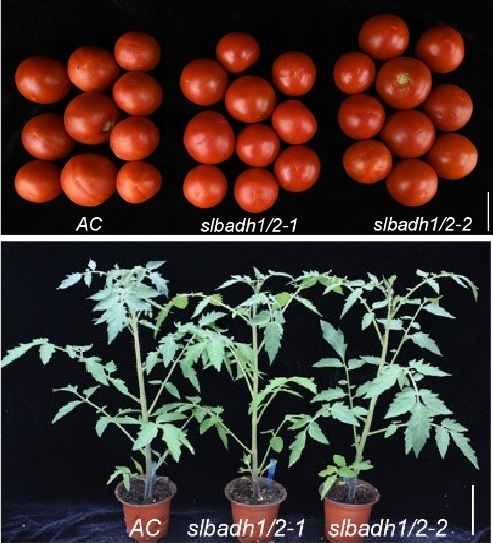 研究团队首先在番茄基因组中鉴定出两个BADH家族基因SlBADH1和SlBADH2,并在番茄栽培品种中分别及同时敲除了SlBADH1和SlBADH2。研究发现,单独敲除SlBADH2即可使番茄叶片和果实产生明显的“爆米花”香气,并且2-AP含量显著上升,表明SlBADH2是调控番茄2-AP合成的关键基因。