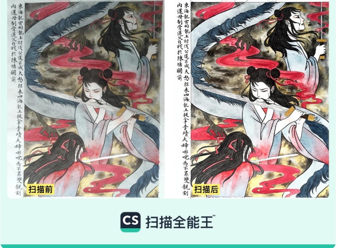 国漫的生命力,不仅来源于专业创作者,更来自大众参与。无论是泛黄的小人书,还是张贴的国风海报,用户只需随手一拍,扫描全能王即可一键生成清晰的黑白线稿,方便用户临摹、填色。