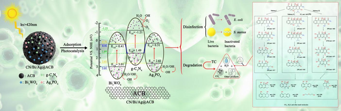 针对上述难题,团队另辟蹊径,利用常见的农林废弃物,制备出高比表面积的多孔生物炭,并采用“超声-球磨、水热合成与化学共沉淀”绿色合成策略,率先构建了具有双Z-Scheme异质结的生物炭基石墨相氮化碳/钨酸铋/磷酸银复合光催化剂(CN/Bi/Ag@ACB)。