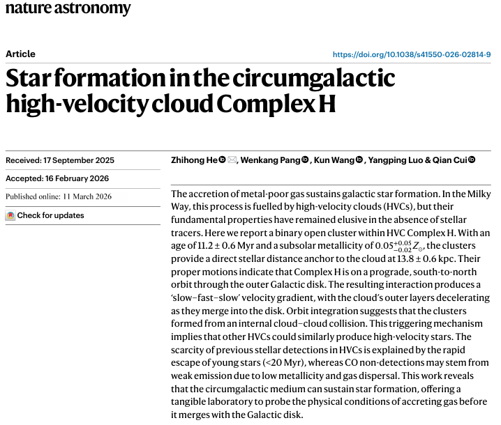 (本文是介绍西华师范大学物天学院何治宏等人在Nature Astronomy发表的题为“Star formation in the circumgalactic high-velocity cloud Complex H”的一篇科普文章。原文链接:https://www.nature.com/articles/s41550-026-02814-9)