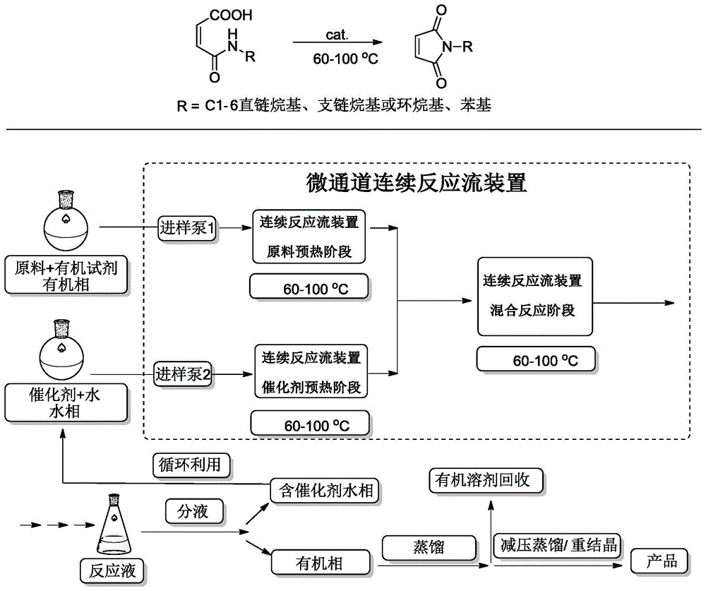 本发明属于精细化工领域,公开了一种制备N‑取代马来酰亚胺的微通道连续流反应工艺。该工艺以原料N‑取代马来酰胺酸溶于有机溶剂配制有机相,以催化剂两性离子葡聚糖溶于水配制水相,两相在微通道连续流反应器中反应制备N‑取代马来酰亚胺。该方法反应条件温和、操作简便,产品收率高、质量稳定,催化剂和溶剂可循环使用,清洁安全高效,适用于大规模工业化生产需要。