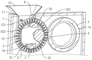 本发明涉及造粒机技术领域,尤其涉及一种辊压式造粒机,其包括外壳,外壳上开设有进料口和出料口;主动造粒辊,转动连接于外壳内壁,主动造粒辊外壁开设有多个主动槽,主动槽用于承接通过进料口进入至外壳内的原料;辅助造粒辊,转动连接于外壳内壁,辅助造粒辊外壁开设有多个辅助槽,辅助槽能随辅助造粒辊转动并和主动槽对齐;驱动组件,用于带动主动造粒辊和辅助造粒辊相向转动;压缩活塞,滑动插接于主动槽内;压实辊,转动连接于外壳的内壁,用于在辅助槽和主动槽对齐时,挤压压缩活塞。本发明能够提高装置造粒的效果。